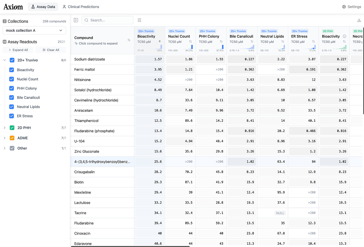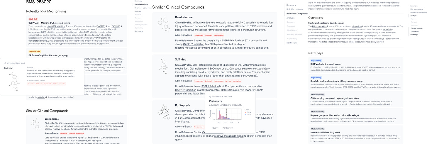 To apply those laws, the team is building a “reasoning agent” connected to a suite of custom tools and massive reference datasets specifically designed for human safety and exposure. The ambition is to move beyond a simple red-light/green-light for toxicity and create a model that acts as a warning system for toxicity in human trials. By parsing the entire corpus of Axiom’s proprietary data - from exposure to metabolism to organ biology to human clinical outcomes - the model constructs a structured reasoning trace, comparing the new candidate to tens of thousands of well-studied historical drugs from Axiom’s experimental dataset; in order to walk the drug hunter step by step through the why behind a prediction.