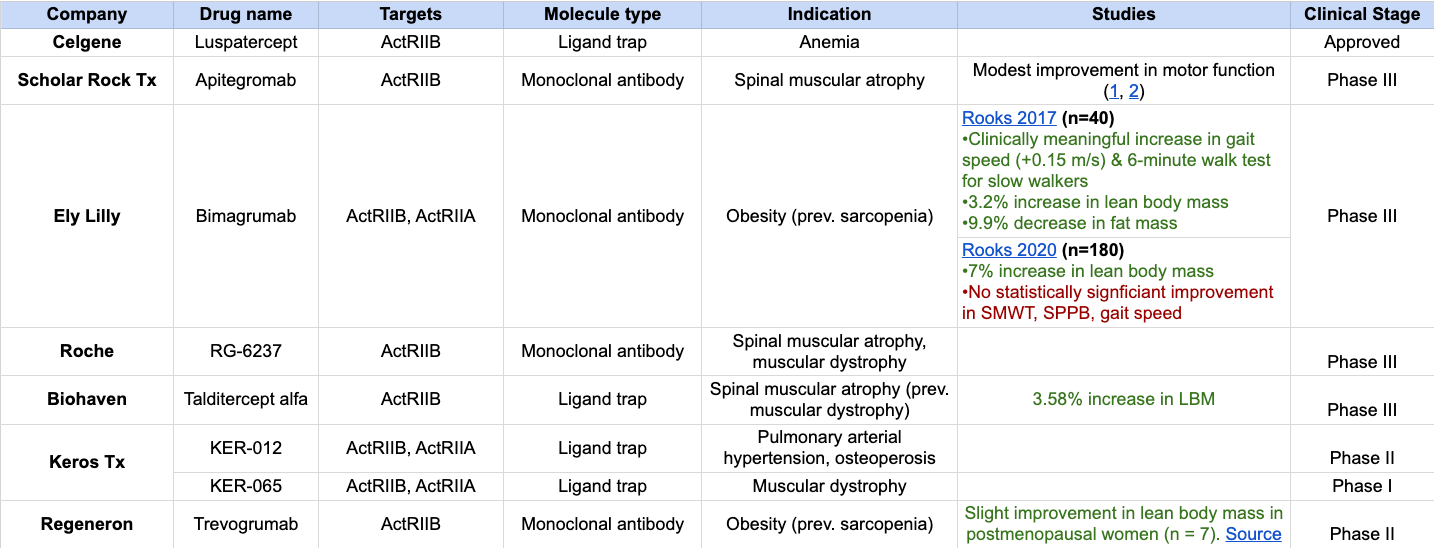 Myostatin / Activin A: SixPeaks, Regeneron, Versanis (acquired by Eli Lilly), Roche, Keros Therapeutics, Merck (acquired Acceleron), Scholar Rock Therapeutics