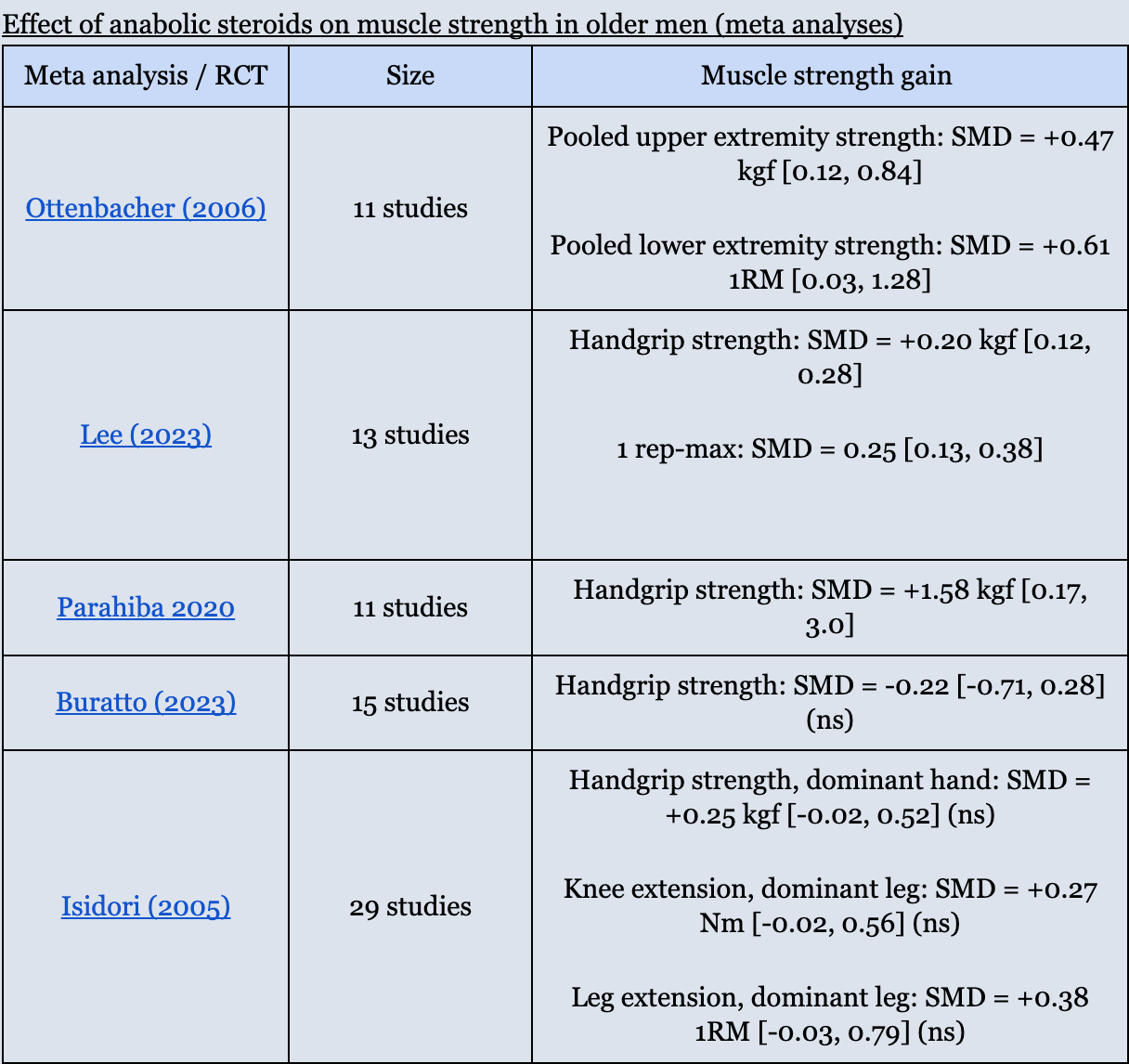 Isidori (2005): Reported no statistically significant differences between testosterone treatment and placebo for strength measures such as handgrip and leg extension.