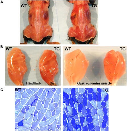 Myostatin genetic KO mice have pronounced muscular phenotype. Source