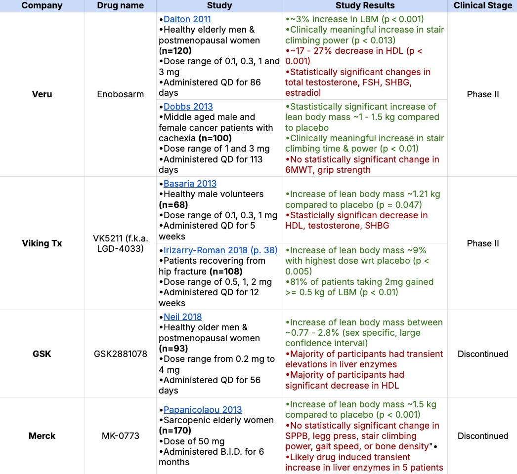 Below is a table of compiled efficacy of various SARMs in clinical studies: