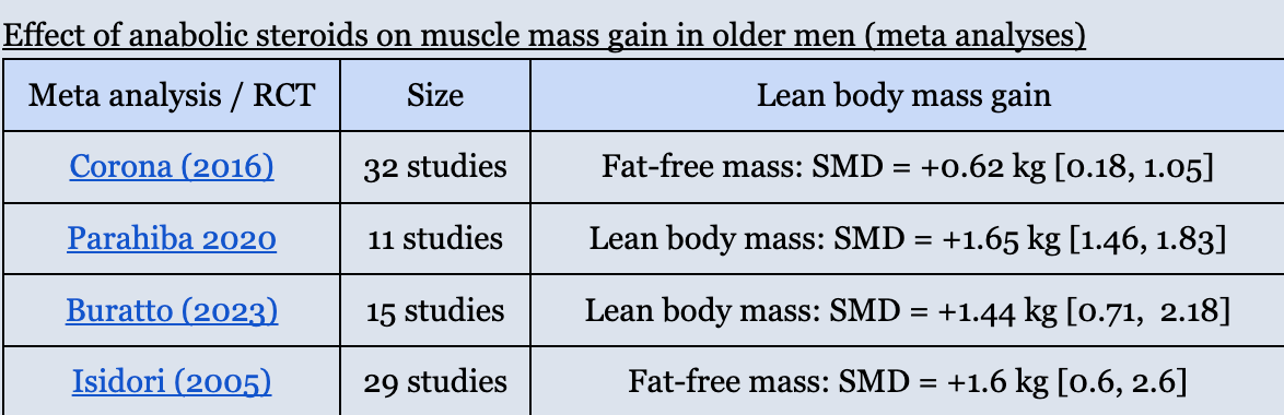 Given that AAS are primarily used for hormone replacement or supplementation in a clinical setting, the vast amount of literature on anabolic steroids is under the lens of treating hypogonadal older men; hence, the following data is presented in context of that particular patient population: